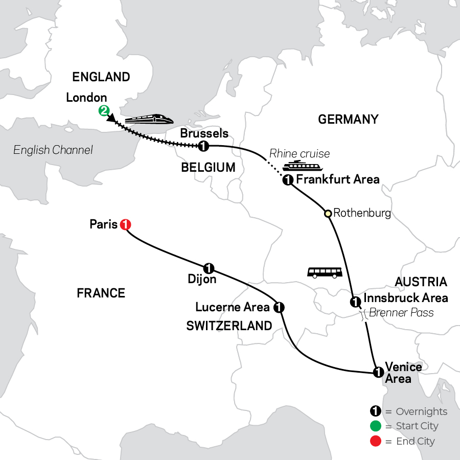If you want to see Western Europe’s main highlights but don’t have much time, this European tour is the vacation for you! Visit England, Belgium, Germany, Austria, Italy, Switzerland, and France and see London, Brussels, Innsbruck, Venice, Lucerne, Dijon, and Paris. After spending some time in London, you’ll travel to Brussels on the Eurostar train, the easiest way to connect the